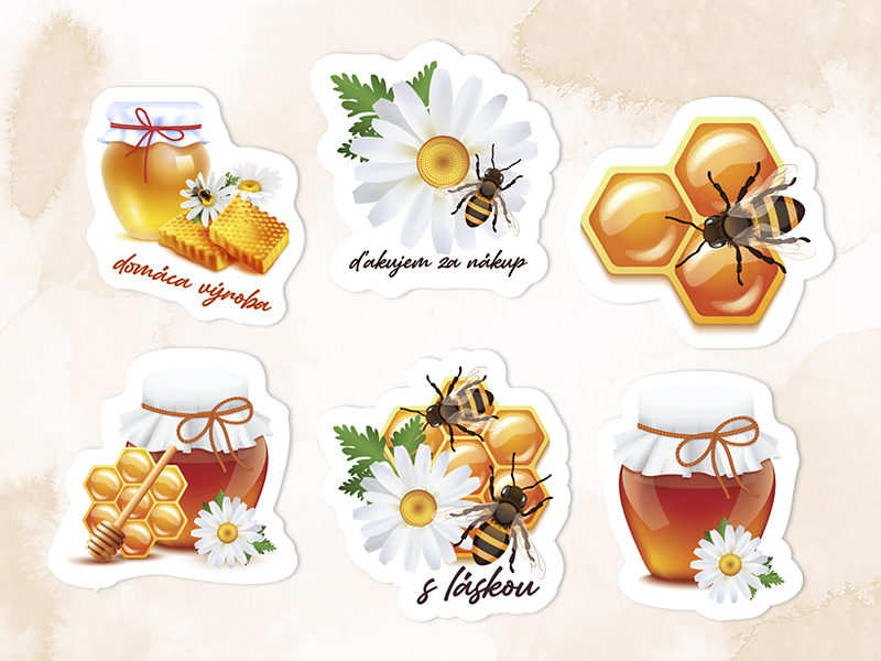 6 druhov vyrezávaných nálepiek s motívmi medu, včielok a kvetov.