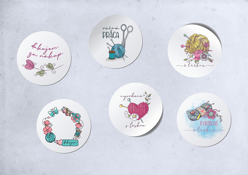 Okrúhle nálepky s priemerom 4cm s grafikou pre handmade výrobky a nápismi: "ďakujem za nákup", "ručná práca", "ďakujem", "s láskou", "vyrobené s láskou"