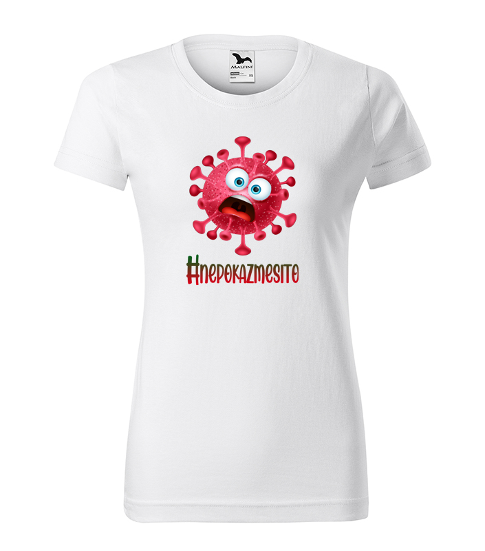 Jemne ironické biele bavlnené tričko s krátkym rukávom dámskeho strihu s potlačou na aktuálnu tému.