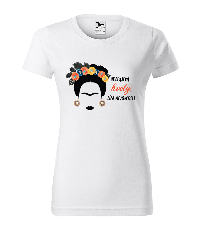 Biele dámske bavlnené tričko s krátkym rukávom s obľúbeným motívom Fridy so slovenským textom alebo španielskym textom.