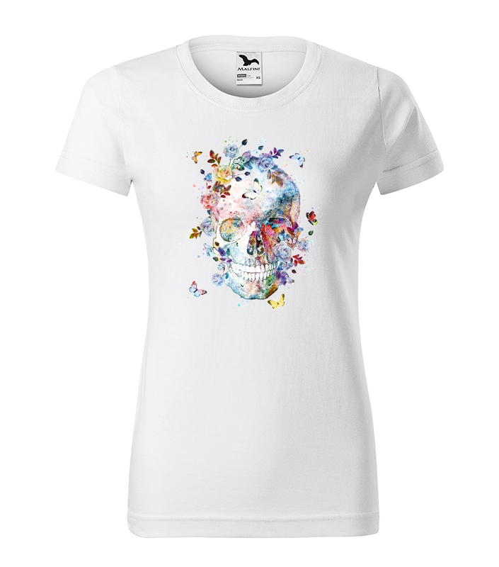 Biele dámske bavlnené tričko s krátkym rukávom s potlačou lebky a kvietkami v jemných farbách.