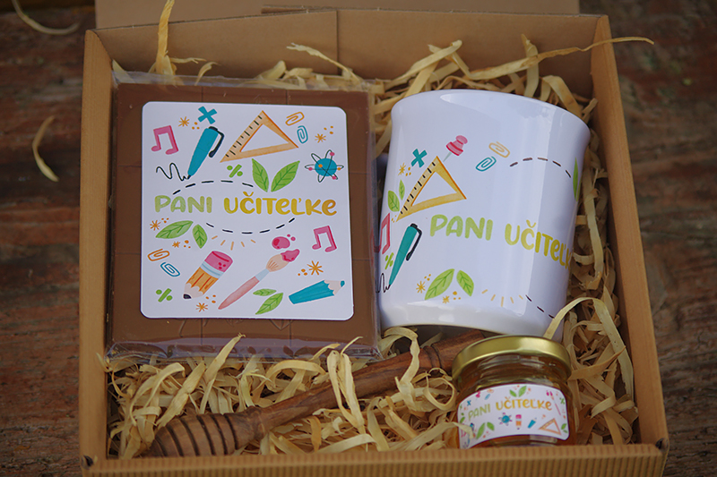 Darčeková krabička s hrnčekom, čokoládou, malým medíkom a drevenou paličkou na med (medníkom) určite vašu pani učiteľku poteší.