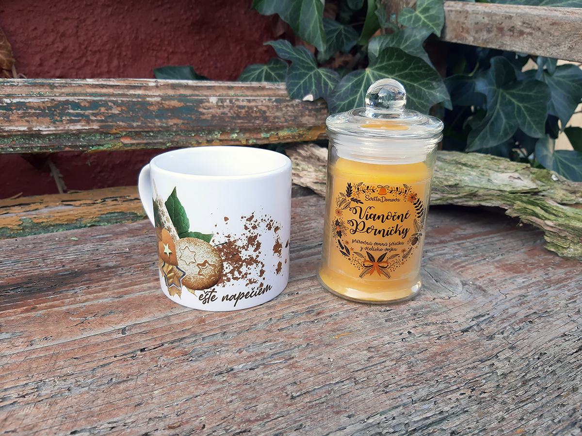 Vianočná darčeková krabička obsahuje hrnček Ešte napečiem klasický 330 ml alebo malý espresso hrnček 150ml a sviečku zo sójového alebo včelieho vosku 125 g v skle.