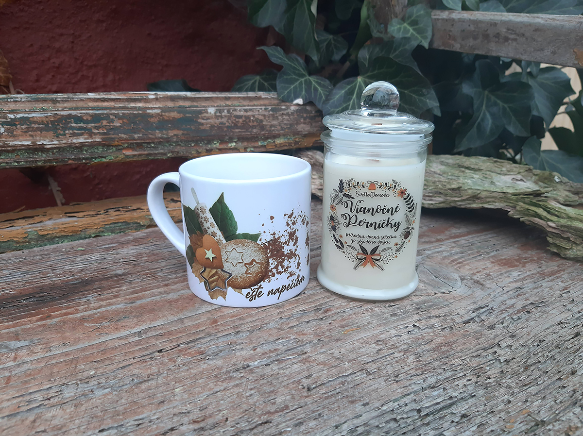 Vianočná darčeková krabička obsahuje hrnček Ešte napečiem klasický 330 ml alebo malý espresso hrnček 150ml a sviečku zo sójového alebo včelieho vosku 125 g v skle.