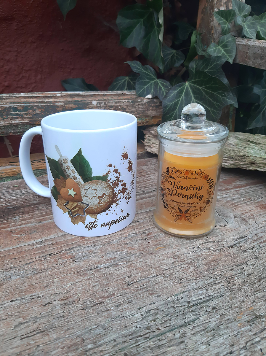 Vianočná darčeková krabička obsahuje hrnček Ešte napečiem klasický 330 ml alebo malý espresso hrnček 150ml a sviečku zo sójového alebo včelieho vosku 125 g v skle.