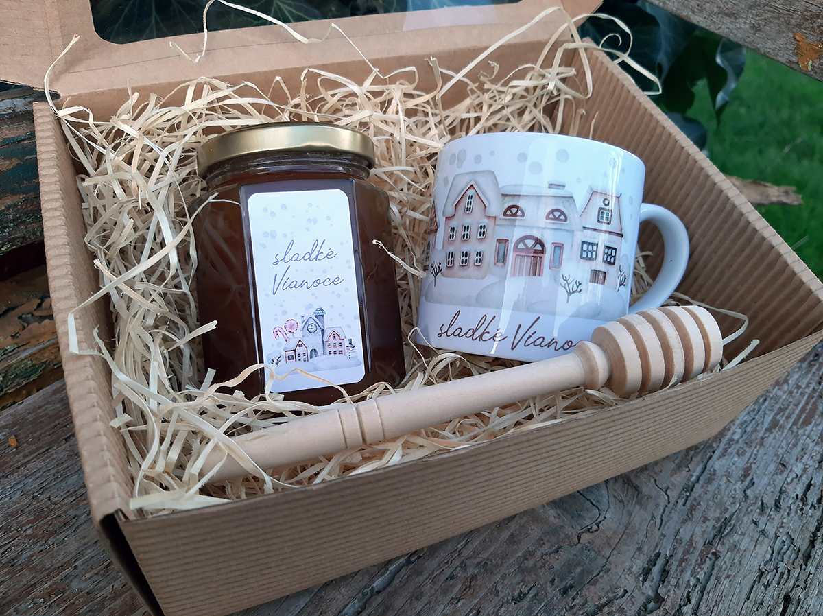 Vianočná darčeková krabička "Sladké Vianoce" obsahuje espresso hrnček Sladké Vianoce 150 ml, med od lokálnych dodávateľov 250g a drevený medník (palička na naberanie medu), ručne vyrábaný sústružením, každý kus je originál.