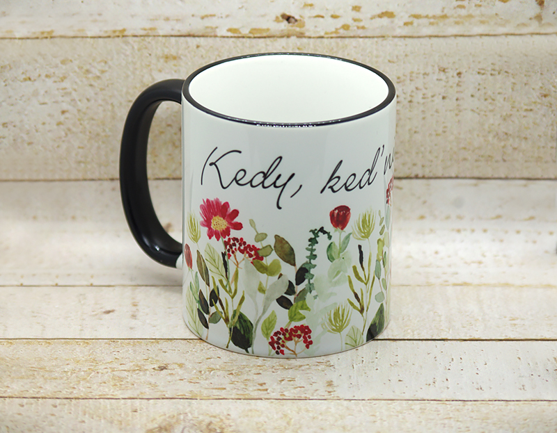 Biely keramický hrnček s čiernym okrajom a uškom s motívom maľovaných kvetov a s nápisom "Kedy, keď nie teraz?"