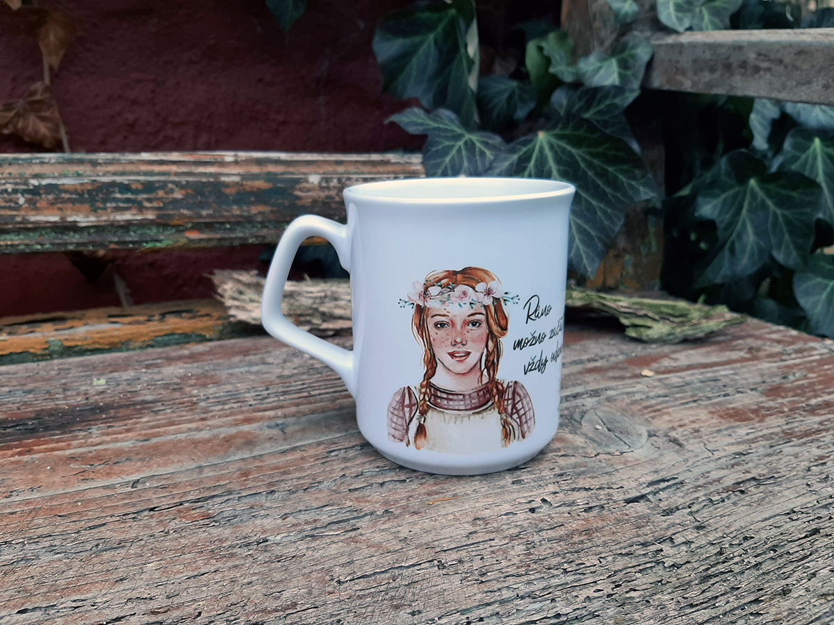 Romantický biely hrnček s motívom a citátom Anny zo Zeleného domu: "Ráno možno začať vždy odznova a bez chýb.