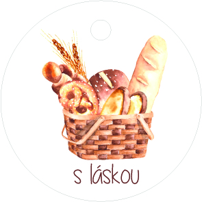 Kartičky s dierkou na zavesenie, potlačené motívom chlebíka, pečiva, kváskovania a lásky k pečeniu na A4 papier s gramážou 250g. Vyrezávané plotrom. Priemer kartičky 5cm, dierka 0,50cm. 20ks kartičiek na jednej A4. Slovenský alebo český text. Na výber je celá A4 rovnakého motívu alebo mix troch motí... celý popis