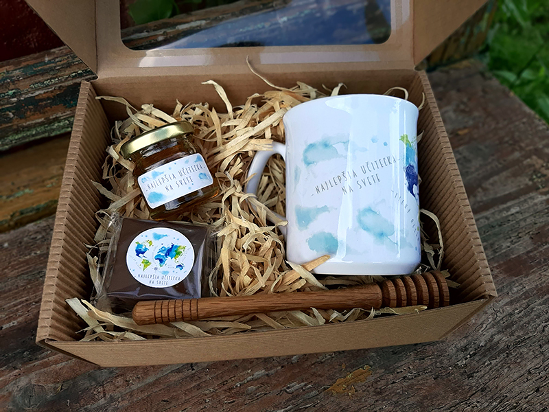 Darčeková krabička s hrnčekom, čokoládkou, malým medíkom a drevenou paličkou na med (medníkom) určite vašu pani učiteľku poteší.