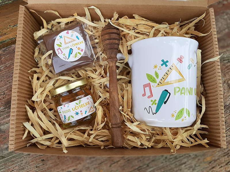 Darčeková krabička s hrnčekom, čokoládkou, malým medíkom a drevenou paličkou na med (medníkom) určite vašu pani učiteľku poteší.