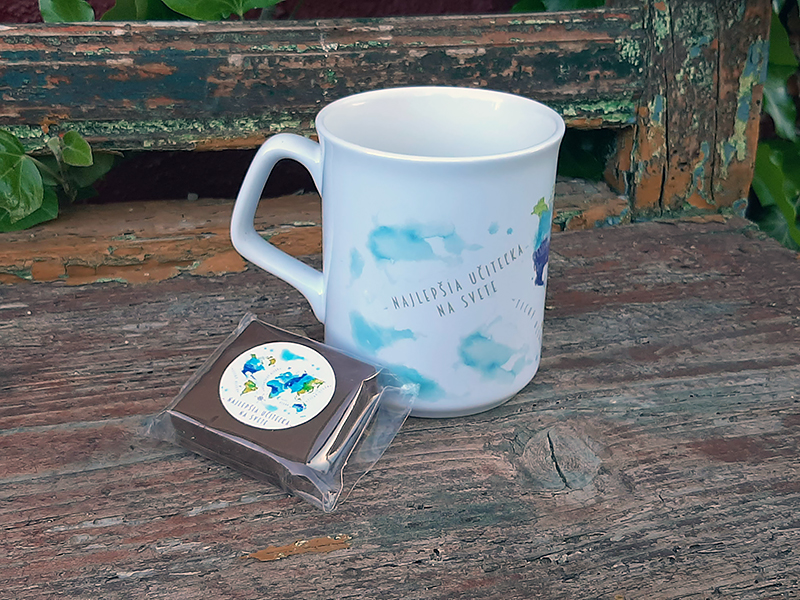 Mini darčeková krabička s hrnčekom a čokoládkou určite vašu pani učiteľku poteší.