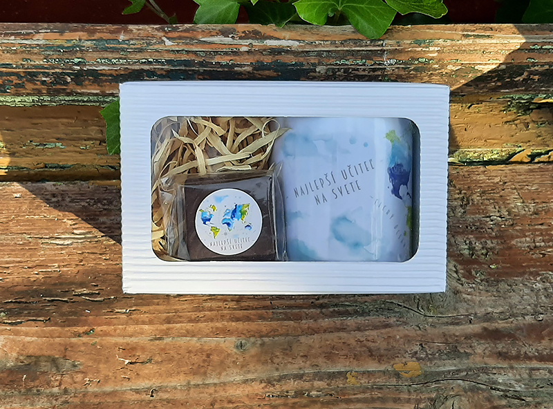 Mini darčeková krabička s hrnčekom a čokoládkou určite vášho pána učiteľa poteší.