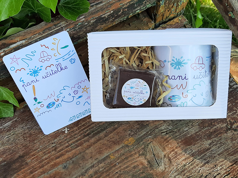 Mini darčeková krabička s hrnčekom a čokoládkou určite vašu pani učiteľku poteší.