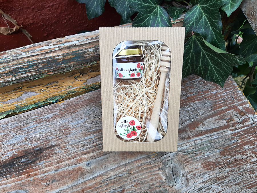 - malý medík 50g od lokálnych dodávateľov s nálepkou potlačenou grafikou s vlčími makmi a nápisom "všetko najlepšie"