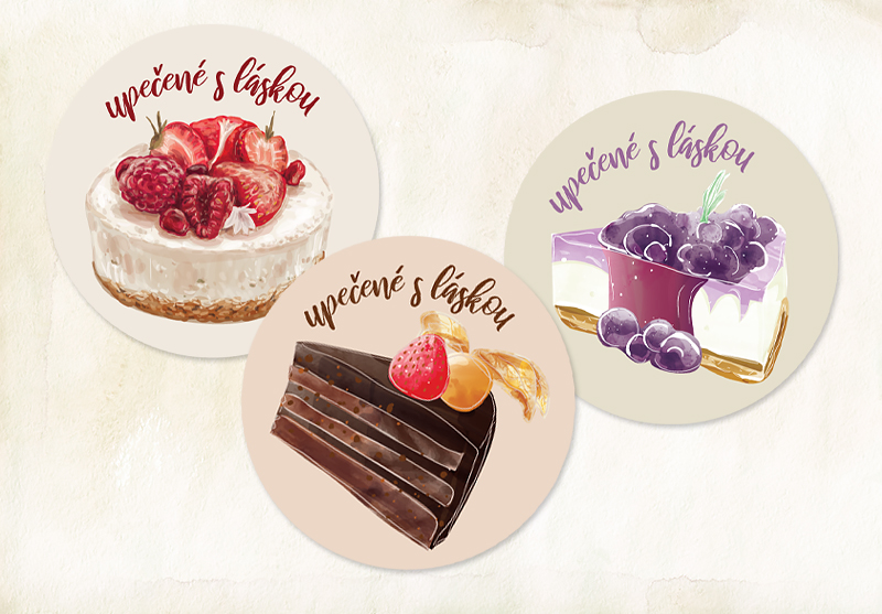 Okrúhle nálepky s priemerom 4cm s tromi druhmi cheesecakov a nápisom "upečené s láskou"