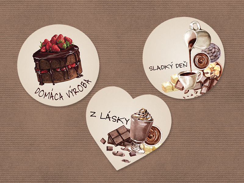 Okrúhle a srdiečkové nálepky s priemerom 4,8cm s motívom čokolády a čokoládovej torty.