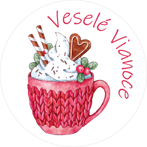 Na hárku A4 je 24ks rovnakých nálepiek s priemerom 4cm s jedným motívom s hrnčekom vo svetríku alebo čiapkou a klbkami.