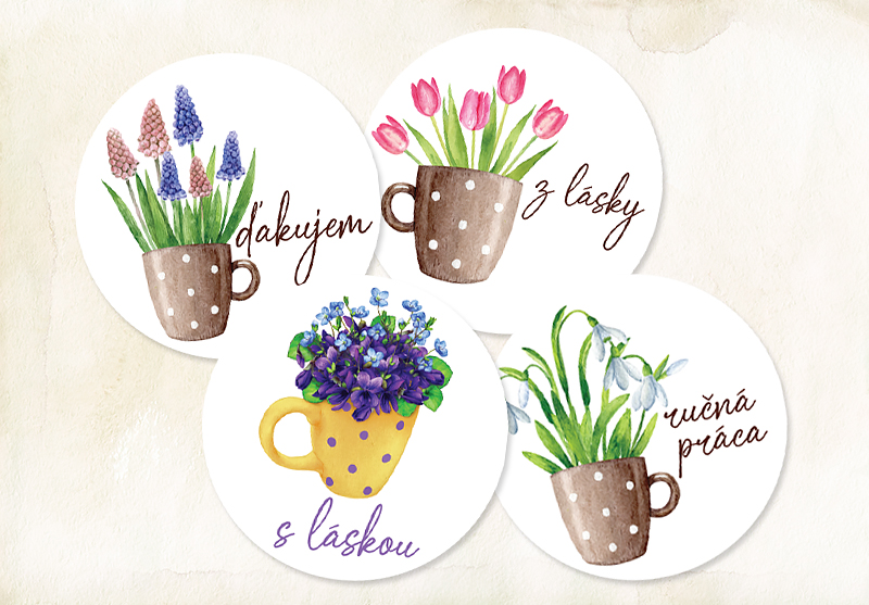 Okrúhle nálepky s priemerom 4cm s jarným motívom a nápismi: "s láskou", "ďakujem", "z lásky", a "ručná práca".
