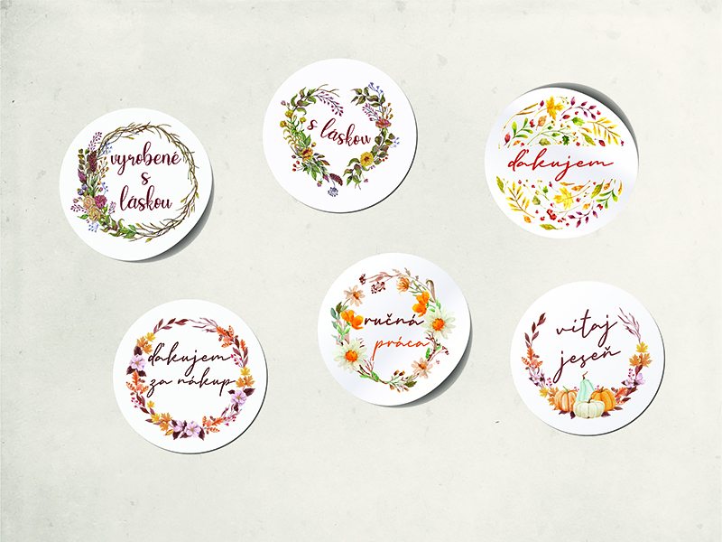 Okrúhle nálepky s priemerom 4cm s jesenným motívom a nápismi: "vitaj jeseň", "ďakujem za nákup", "vyrobené s láskou", "ďakujem", "ručná práca", "s láskou".