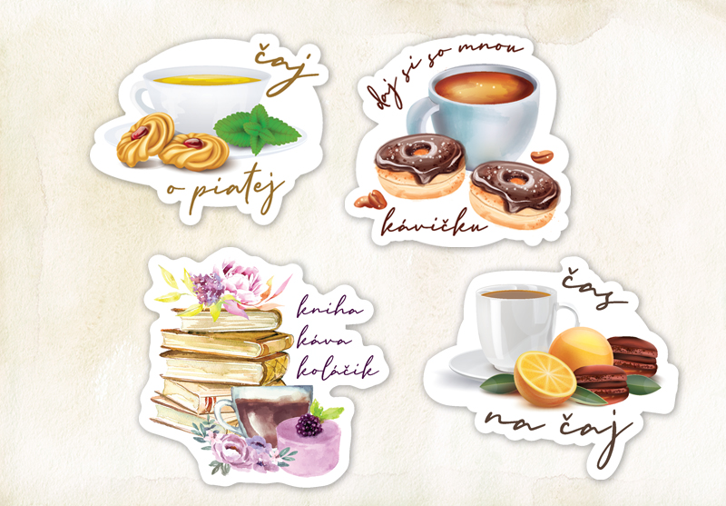 Nálepky so štyrmi motívmi kávy, čaju a koláčikov.