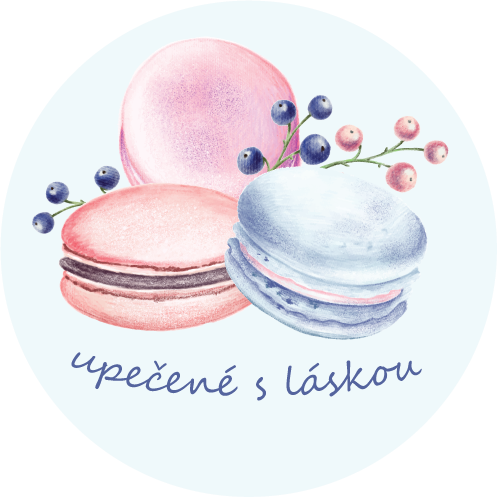 Okrúhle nálepky s priemerom 4cm s makrónkami a nápisom "upečené s láskou"