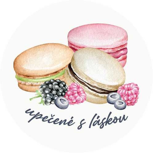 Okrúhle nálepky s priemerom 4cm s makrónkami a nápisom "upečené s láskou"