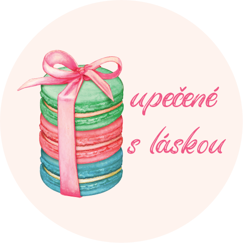 Okrúhle nálepky s priemerom 4cm s makrónkami a nápisom "upečené s láskou"
