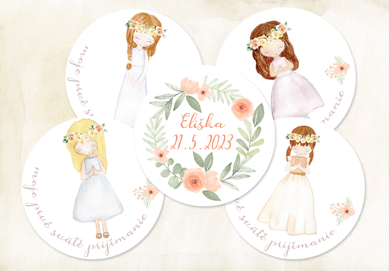 Okrúhle nálepky Moje prvé sväté prijímanie - na hárku sú dva motívy: dievčatko a nápis "moje prvé sväté prijímanie a venček s menom dievčatka a dátumom prijímania.