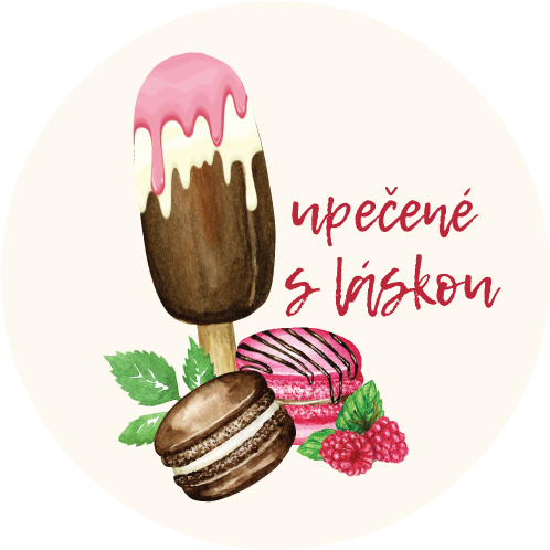 Okrúhle nálepky (motív 1 a 2) s priemerom 4cm s nanukmi, makrónkami a nápisom "upečené s láskou"