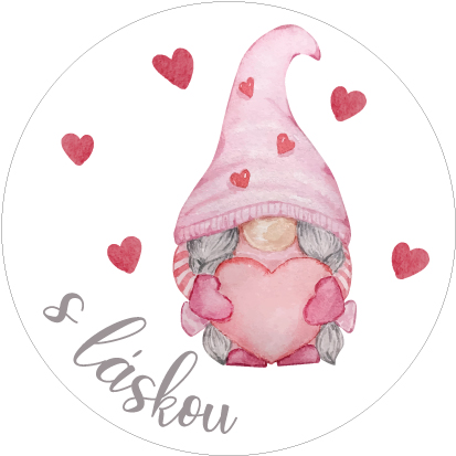 Okrúhle valentínske nálepky - dva motívy: srdiečková nálepka "z lásky" alebo trpaslík so srdiečkom a nápisom "s láskou" s priemerom 4cm.