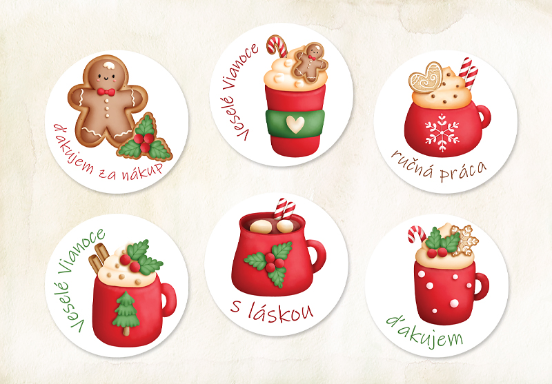 Okrúhle nálepky s priemerom 4cm s vianočným motívom a nápismi: "ďakujem za nákup", "s láskou", "ďakujem", "ručná práca" a "Veselé Vianoce".
