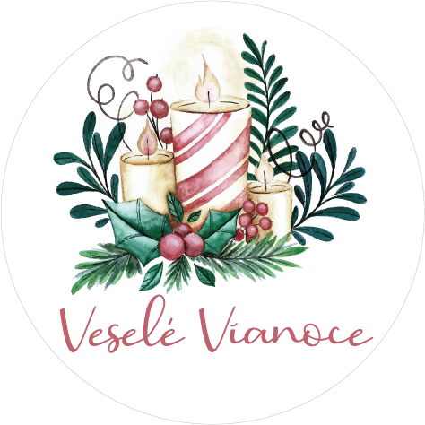 Okrúhle vianočné nálepky s priemerom 4cm so sviečkou, esenciálnym olejom alebo prírodnou kozmetikou s nápisom: "Veselé Vianoce".