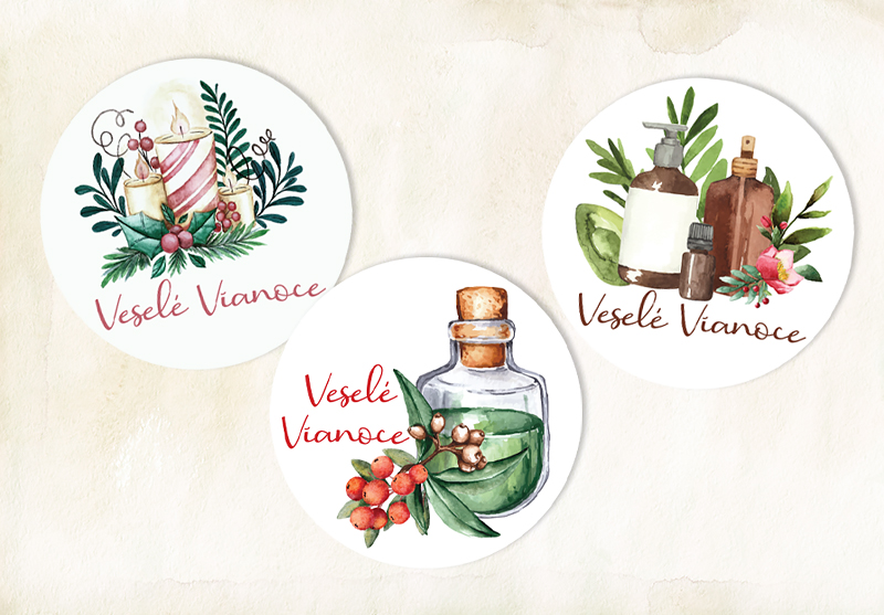 Okrúhle vianočné nálepky s priemerom 4cm so sviečkou, esenciálnym olejom alebo prírodnou kozmetikou s nápisom: "Veselé Vianoce".