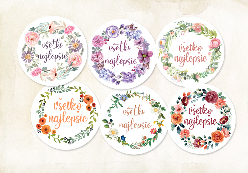 Okrúhle nálepky s priemerom 4cm na darčeky so šiestimi druhmi kvetinkových venčekov s nápisom "všetko najlepšie".