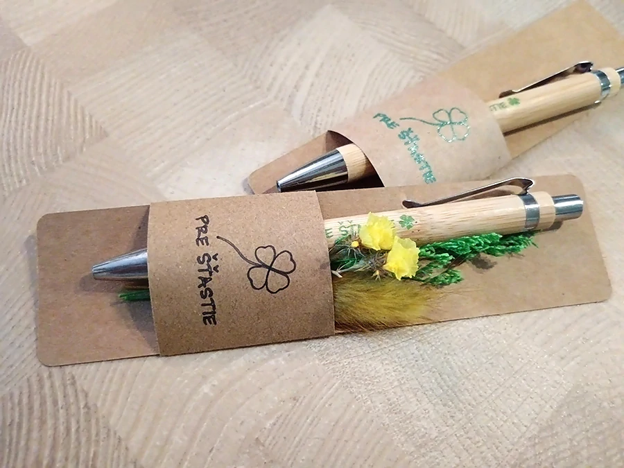 Guľôčkové pero z bambusu s kovovým klipom, modrou náplňou a nápisom v kraftovom obale ozdobené sušenými kvetinkami.