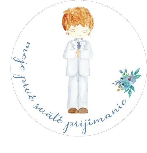 Okrúhle nálepky Moje prvé sväté prijímanie - na hárku sú dva motívy: chlapček a nápis "moje prvé sväté prijímanie a venček s menom chlapčeka a dátumom prijímania.  Grafika vytlačená atramentovou tlačiarňou na papierové nálepky, kde je tlač trošku svetlejšia a obyčajnejšia alebo na fotomatné nálepky,... celý popis