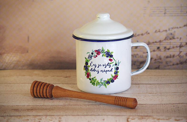 Retro plechový biely hrnček s modrým lemom a viečkom. Hrnček má akoby starú, nerovnomernú "ošúchanú" povrchovú úpravu a je potlačený ovocným motívom a nápisom "Čaj je vždy dobrý nápad".
