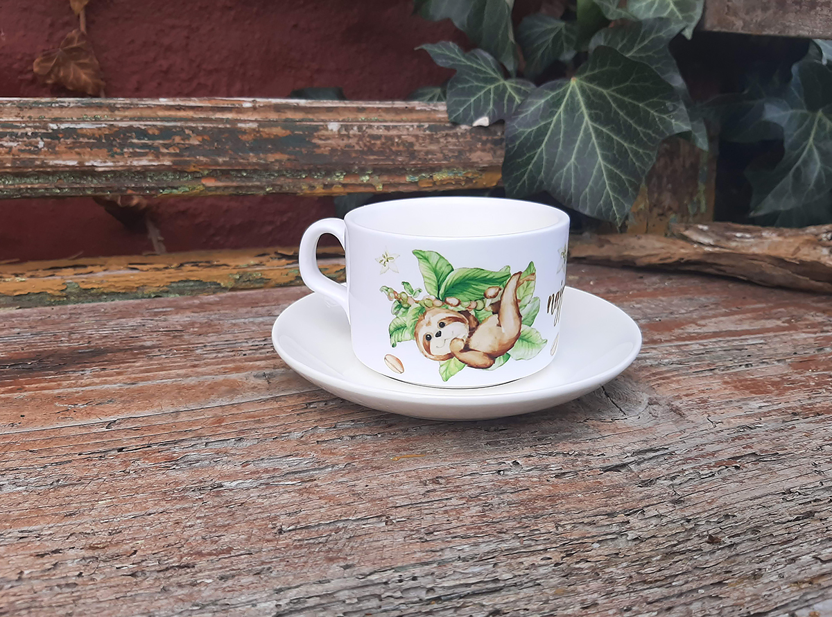 Šálka s objemom 150 ml s leňochodom a nápisom "najprv káva" s tanierikom.