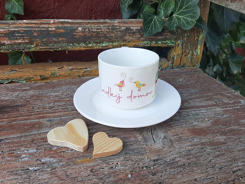 Biela keramická šálka s tanierikom s objemom 170ml s jemnou potlačou kvietkov s domčekom a nápisom "sladký domov". Ideálna ako darček na návštevu alebo kolaudáciu.