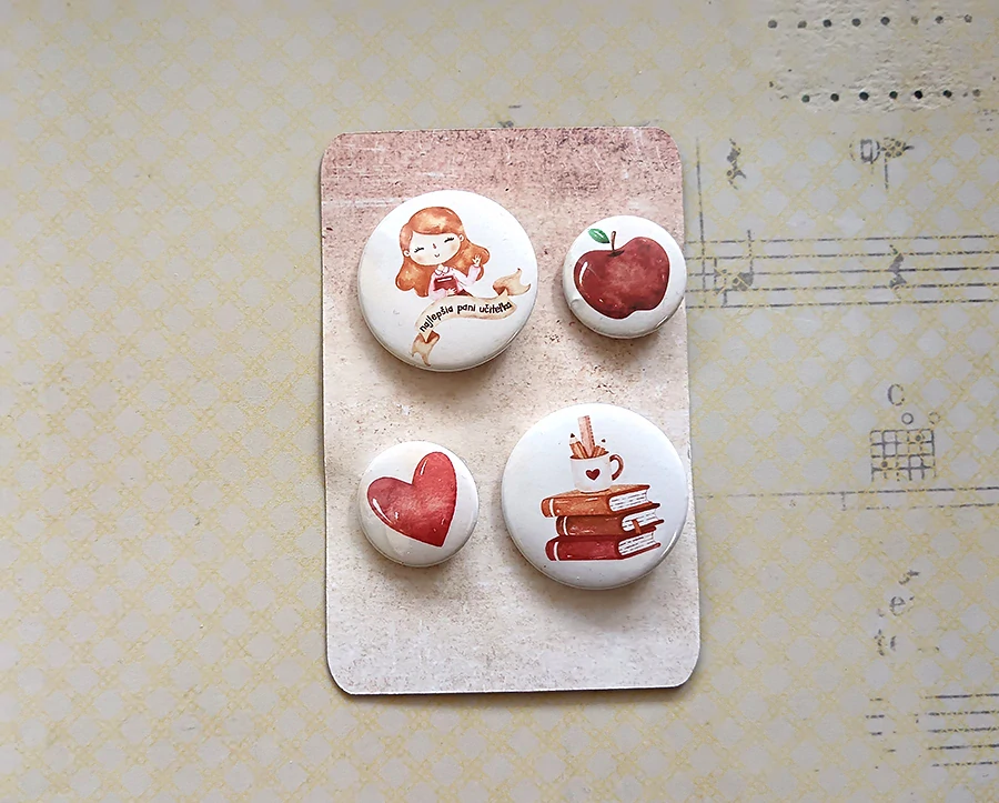 Set štyroch odznačikov pre učiteľov. Dva väčšie okrúhle odznaky s priemerom 37mm plus 2x malý 25mm odznačik.  5 motívov na výber. Grafiku pre odznaky tlačím atramentovou tlačiarňou na fotopapier a chráni ju plastová vrstva. Odznaky sa pripínajú zapínacím špendlíkom. celý popis