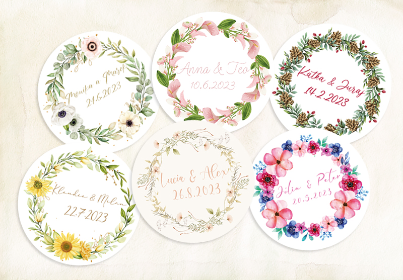 Okrúhle svadobné nálepky s menami snúbencov a dátumom na obálky, krabičky, darčeky...