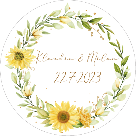 Okrúhle svadobné nálepky s menami snúbencov a dátumom na obálky, krabičky, darčeky...