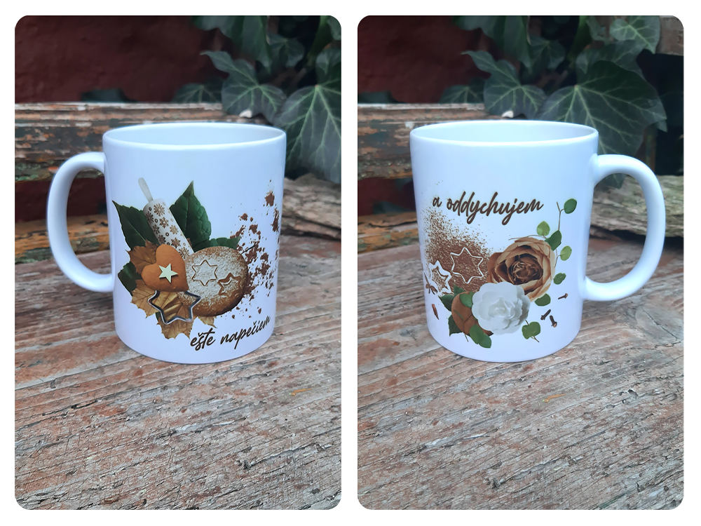 Keramický biely hrnček s perníčkovým vianočným motívom a textom "ešte napečiem a oddychujem" s objemom 330ml alebo 150 ml.