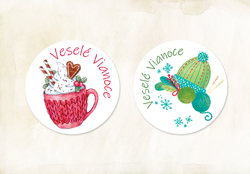 Okrúhle nálepky s priemerom 4cm s vianočnými motívmi pre všetky tvorilky a ich kreatívne balíčky s nápisom: "Veselé Vianoce".