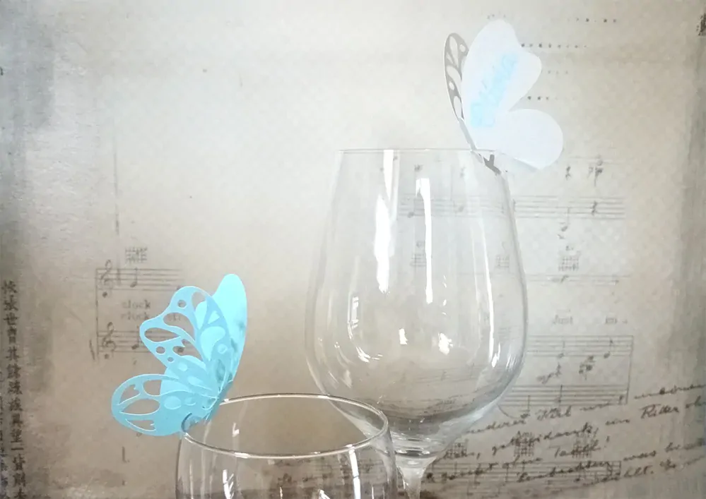 Motýlikové menovky majú šírku 8 cm, ale veľkosť viem prispôsobiť Vašim pohárom. Motýlik má vyrezávané jedno krídlo, na druhom je napísané meno hosťa.